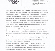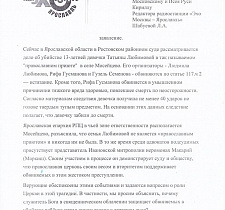 «На сегодняшний день в Ростовском районном суде рассматривается дело об убийстве 13-летней девочки Татьяны Любимовой в селе Мосейцево. На скамье посудимых трое обвиняемых: Любимова, Гусманова и Семенова. Все они обвиняются по статье 117.ч 2 — истязание. Кроме того, Рифа Гусманова обвиняется в умышленном причинении тяжкого вреда здоровью, повлекшем смерть по неосторожности.
